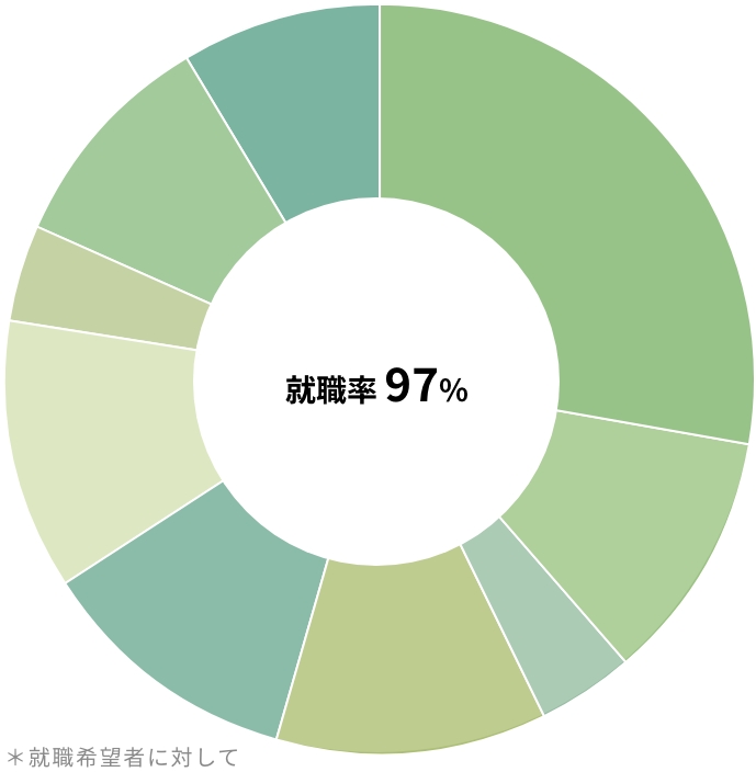 現場同様の経験を実践の中で学べるカリキュラム内容と、入学後1年次より徹底した個別サポートシステムにより、希望の進路へ向けて細やかなキャリアサポートを行なっております。